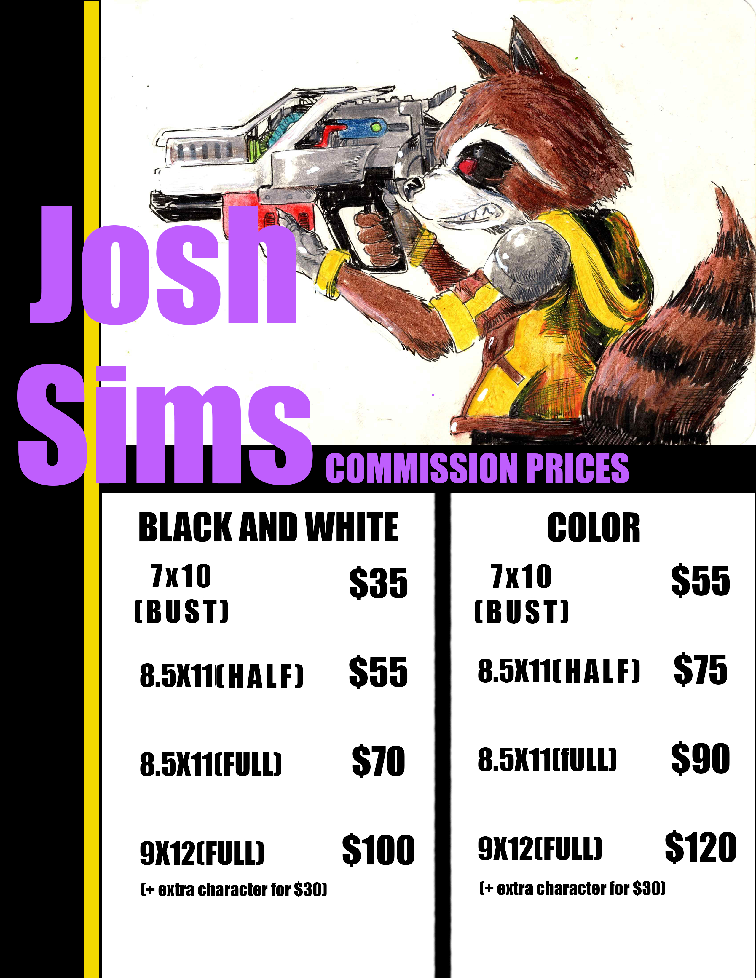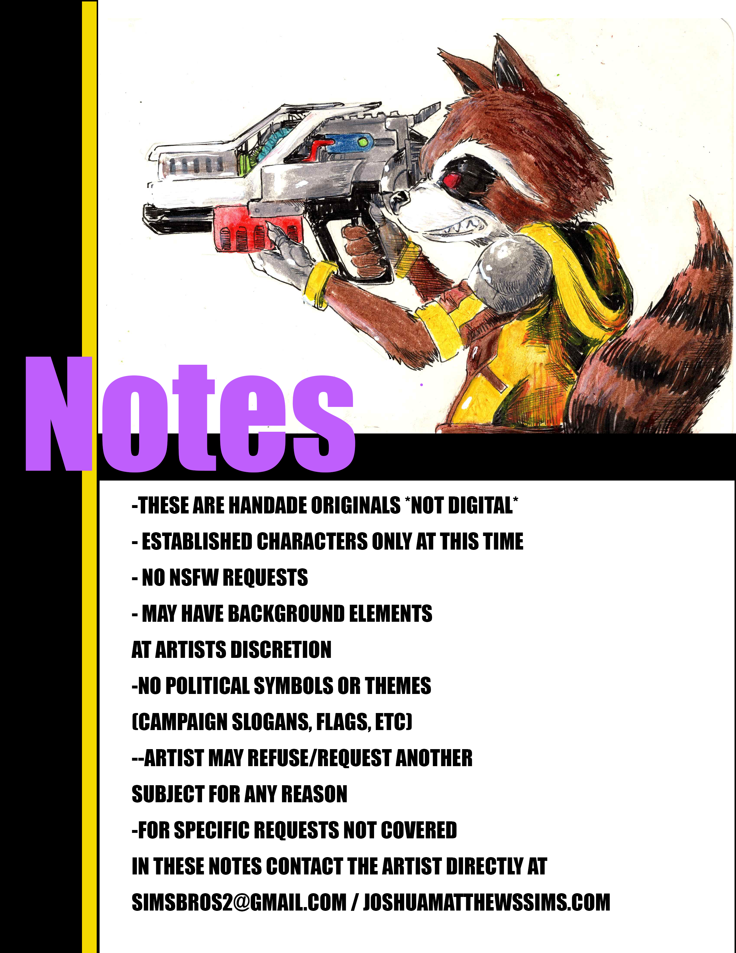 I updated this list to include more precise categories and a larger size for the smallest tier. The notes page is not all encapsulating, or all inclusive. There are exceptions and things not included that I welcome any questions about. For example I am open to doing OCs in some cases, but it will depend on the individual request and context. Please reach out!